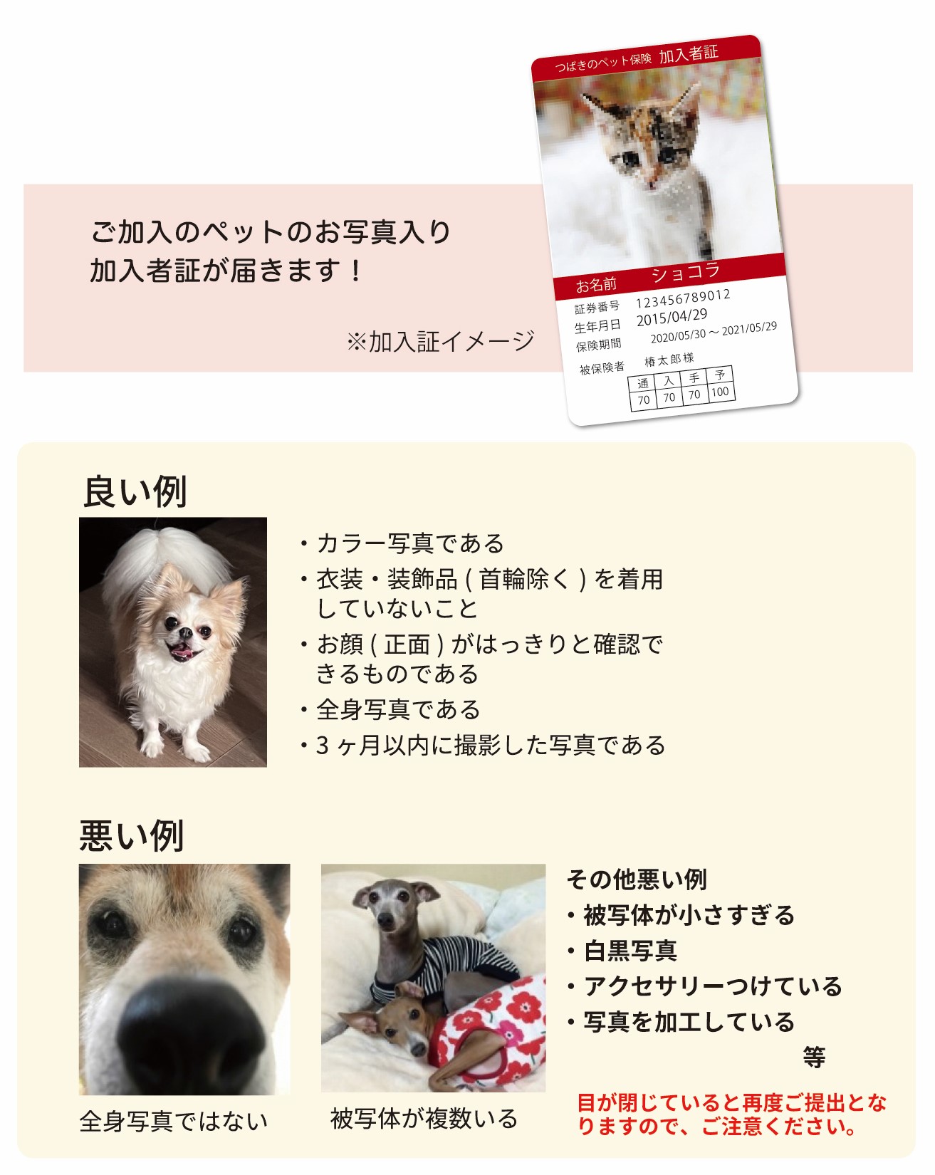 ご提出いただいたペットのお写真は、加入証の作成に使用いたします。